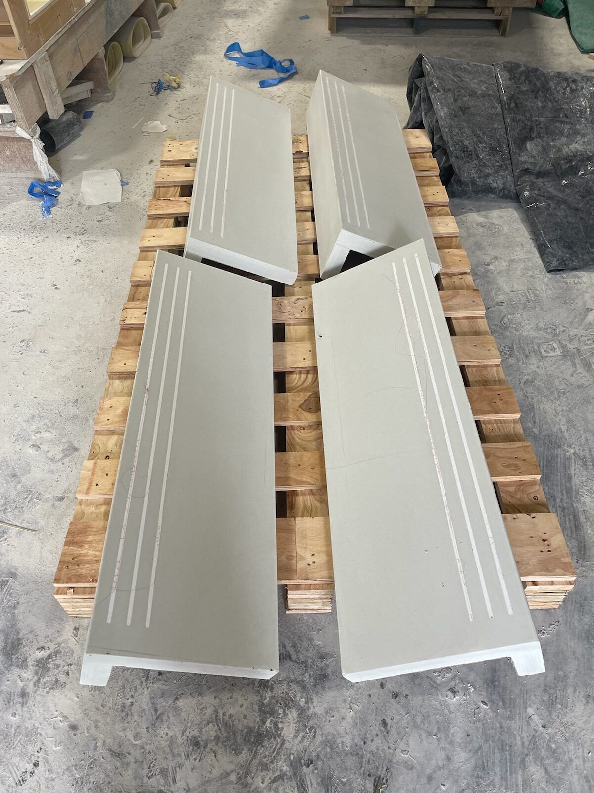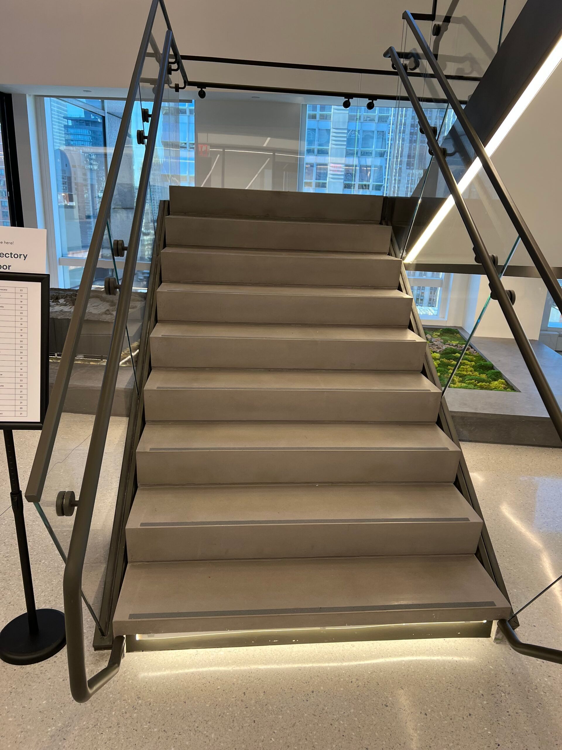 These Glass Fiber Reinforced precast stair treads were created using a specific concrete mix that matched the color expectations while also being durable enough to endure many people stepping on the work day after day. Eventually, we worked to fabricate over 300 parts for multiple different stairs in the building. Types of production parts included both stair treads and landings.