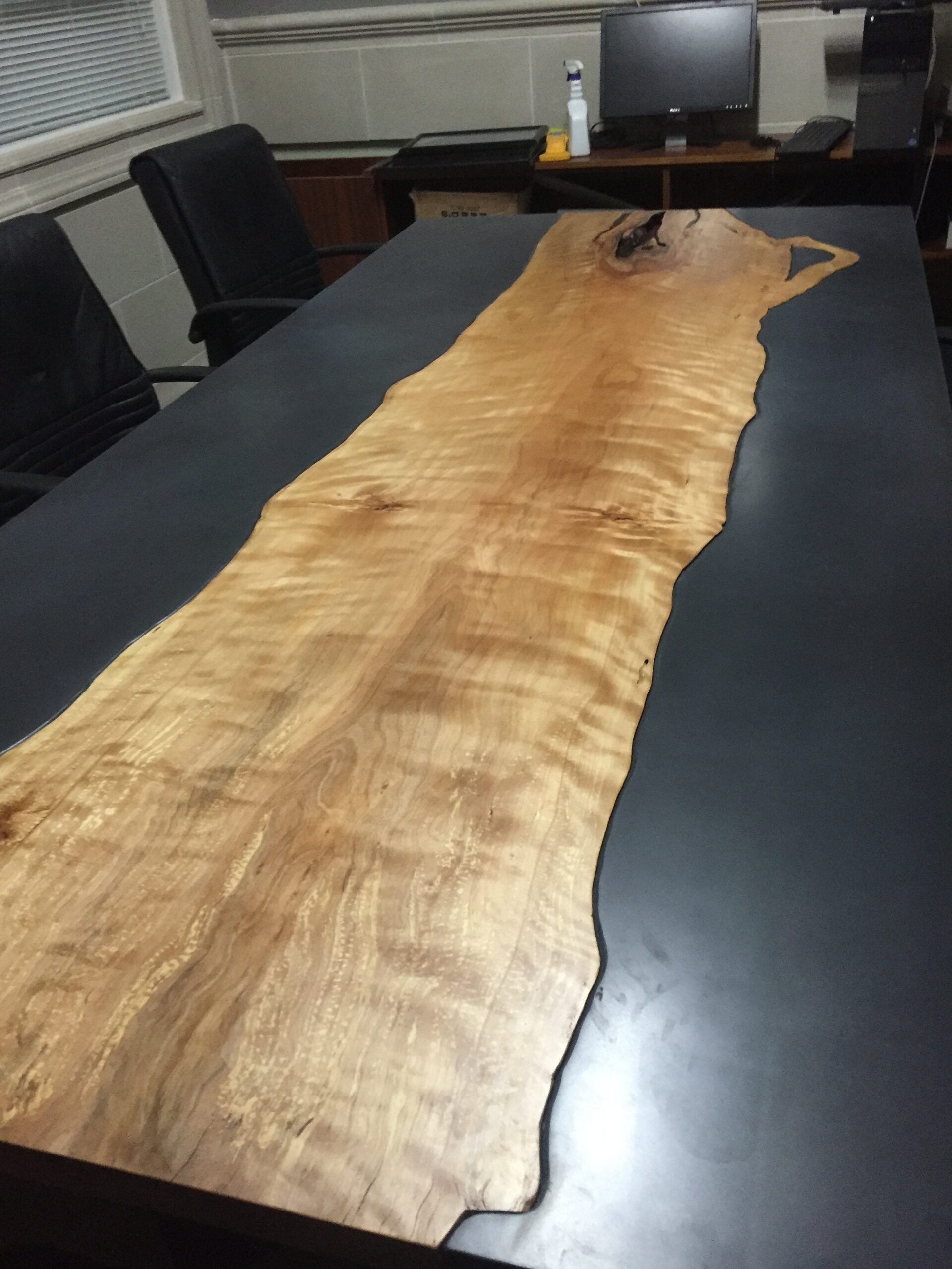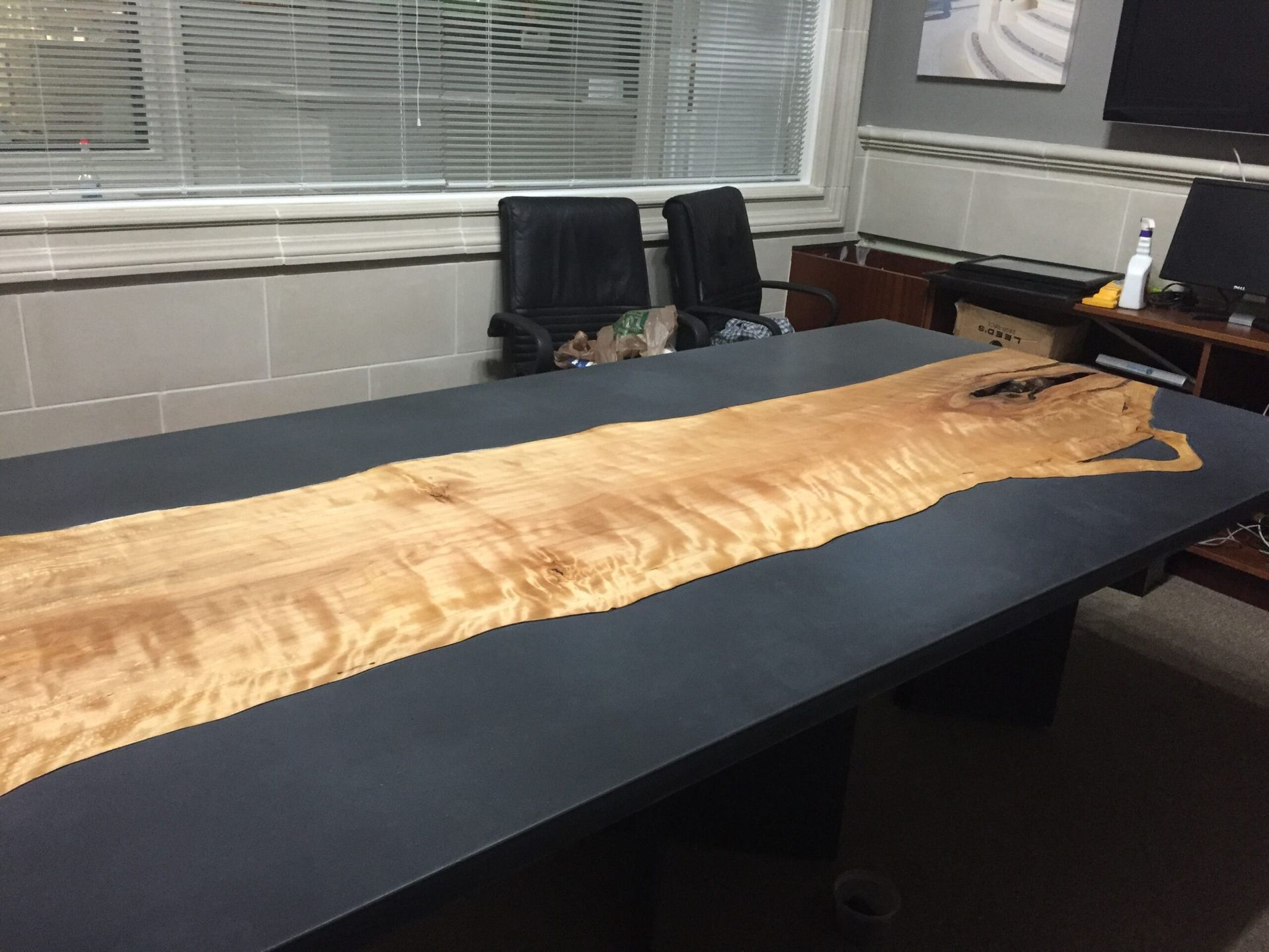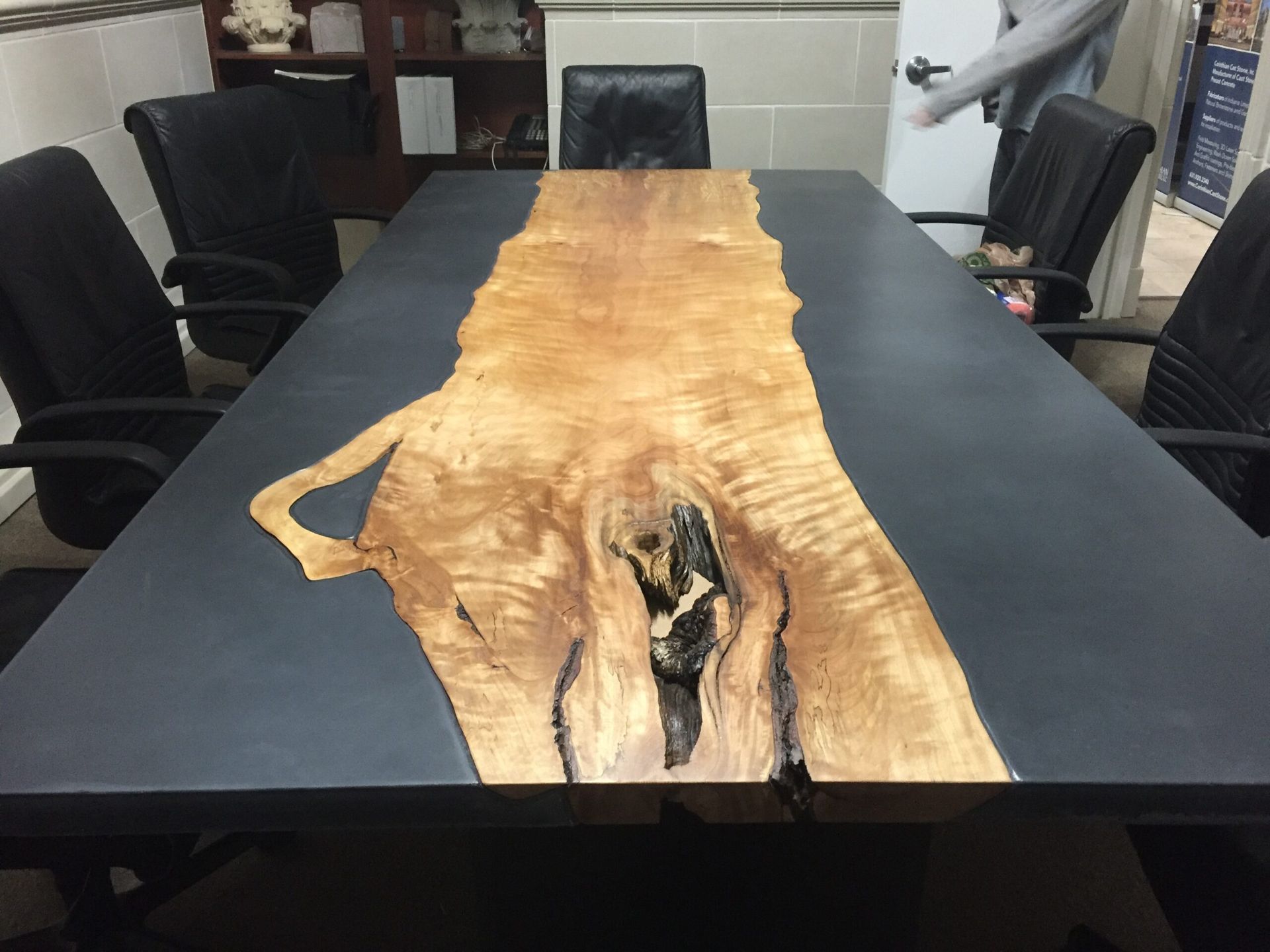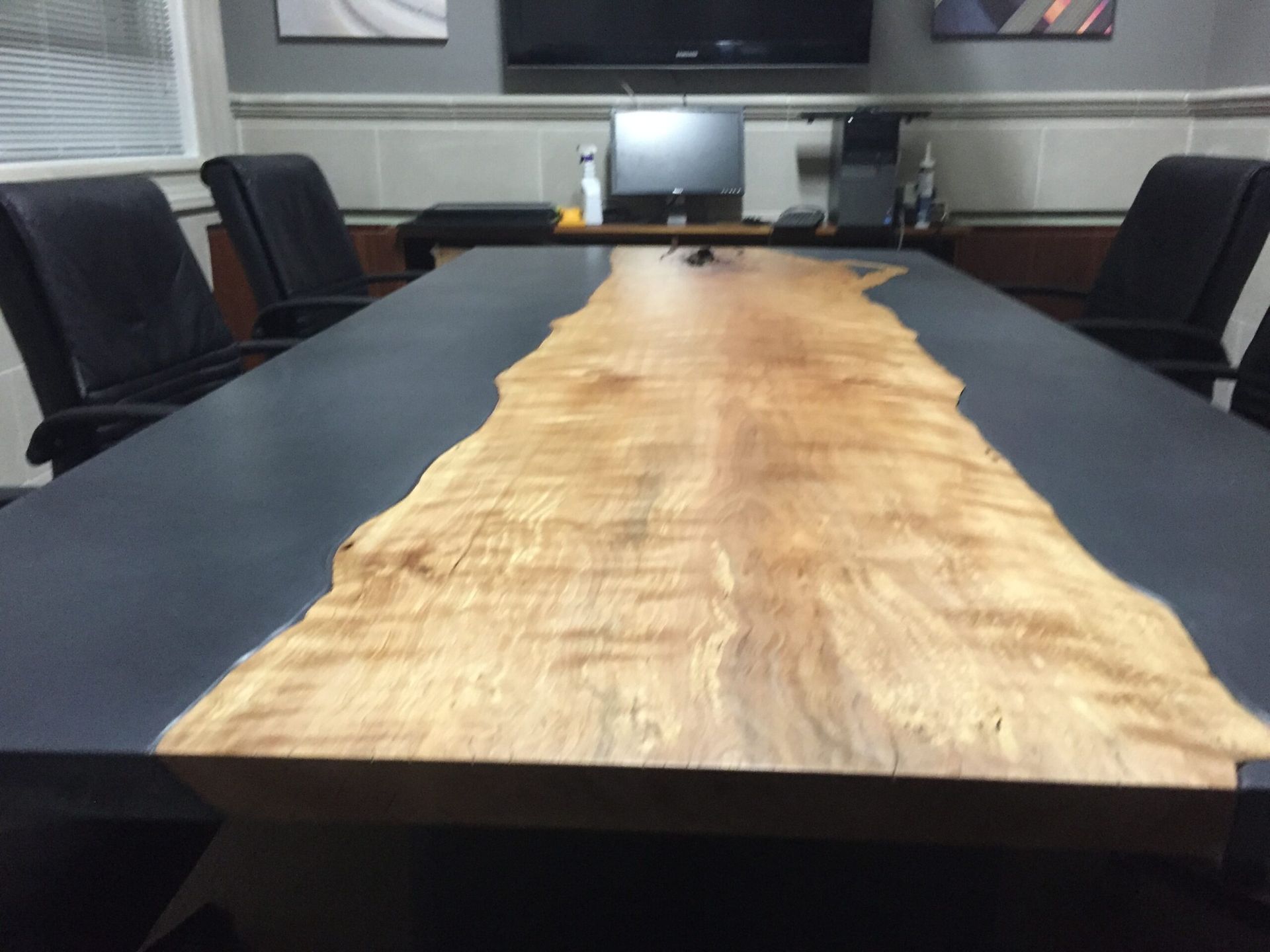 We completed this project at the client's request to have a custom GFRC table created. They chose a slab of oak and wanted it to serve as the middle of a conference table for their office. The surrounding portions of the table were modeled from the original wood slab to allow it to fit perfectly into the table. The concrete was cast from a custom jet black color that we mixed specially for the client.